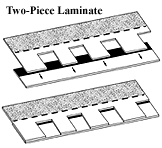 Two-Piece Laminate - (also called "LAMINATE"): a top shingle with sections cut away creating "tabs" of the remaining shingle. This top portion is then laminated to a half shingle which backs the exposed sections. The total effect is multi-layered, dimensional appearance.