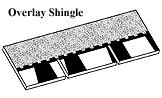 Overlay Shingle - A one-piece base shingle to which overlay pads, consisting of an additional layer of asphalt and granules, are applied in random patterns to simulate two-piece laminated shingles.