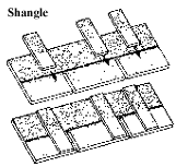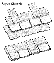 Shangle - the product design concept originated by CertainTeed that was the original laminated shingle. The Shangle features a full size, one piece shingle as a base. Individual shingle tabs or overlay pads are applied to this base shingle providing a dimensional look to the roof.